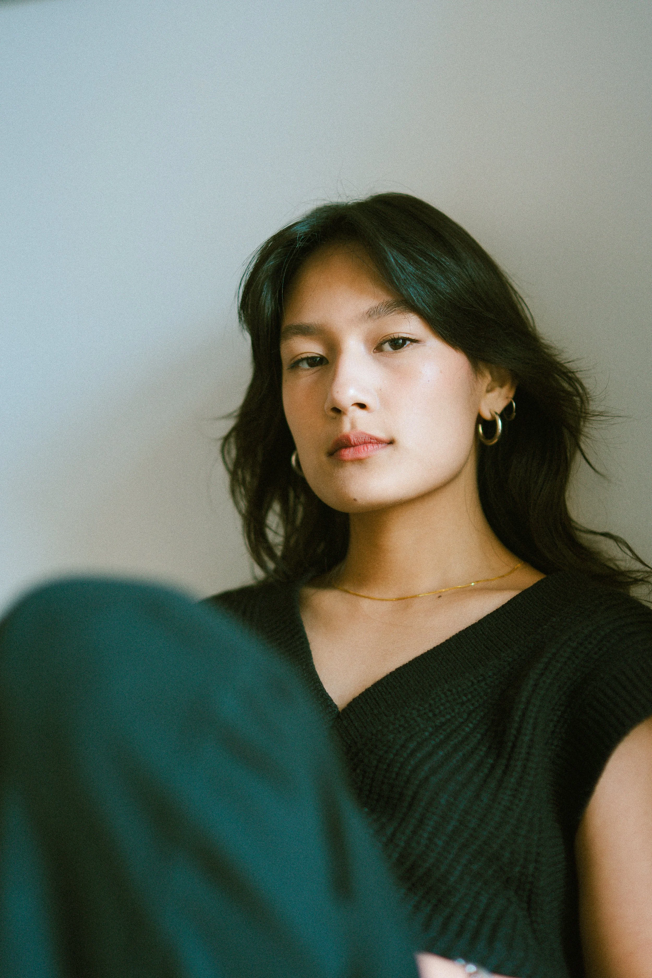 A young woman with black hair and hoop earrings, wearing a black top, sitting against a light-colored wall, looking at the camera with a relaxed expression.
