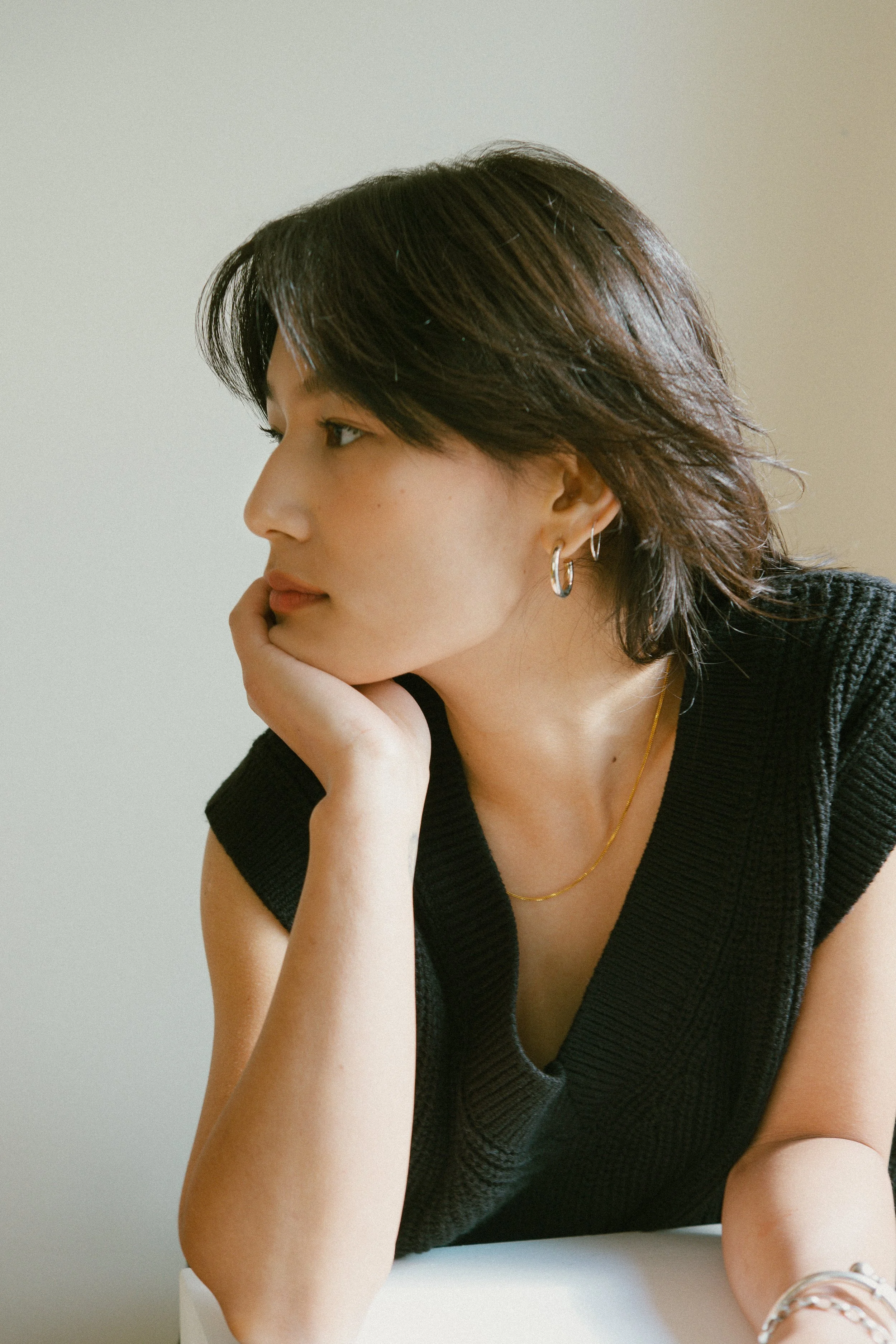 Close-up of a young woman with short dark hair, wearing earrings and a gold necklace, resting her chin on her hand, looking to the side.